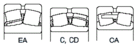 调心滚子轴承,如图所示,有高负荷容量设计的EA型,C型,CD型,CA型。设计上, EA型,C型,CD型 为冲压保持架, CA型为铜合金车制保持架。EA 型轴承具有高负荷容量,低转矩的特长。